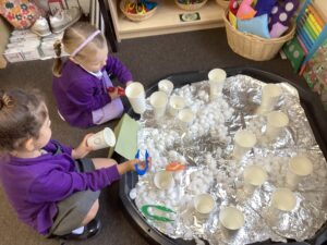 We had an exciting surprise when we noticed that our class friend Lucy was missing! Together, we became investigators, following the clues and discovering that Mr. Freeze had taken her. The children worked collaboratively to design a clever trap and created wonderful signs, using their developing mark-making and early writing skills. We were delighted when Mr. Freeze was finally captured, and Lucy returned safely to join us in class. This playful adventure gave us lots of opportunities for imaginative learning, problem-solving, and creative enhancements.