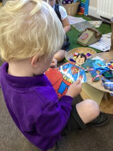 This week, we’ve been thinking all about real-life superheroes and the amazing qualities they have. We talked about the special people in our families who are superheroes to us, like kind mummies, strong daddies, and others who help us feel safe and cared for. We used our big muscles to draw large circles while lying on our tummies, helping to make our core strong—just like a superhero! In our play, we’ve had lots of fun exploring the provision, especially using an old telephone to call our superhero friends and share our important missions.