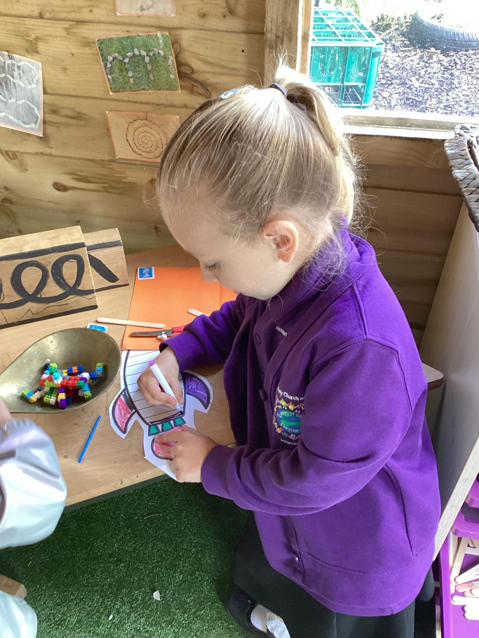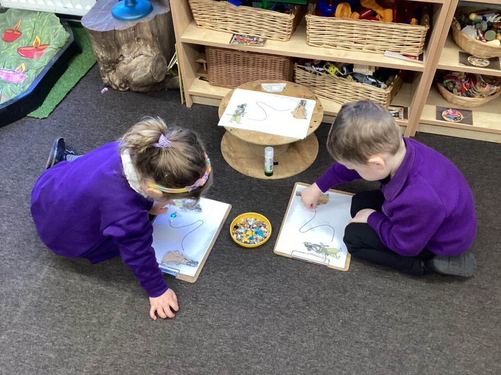 What a surprise we had when we arrived in class to find that the vegetables Mrs Jordan had brought for her lunch had been captured! It didn’t take us long to realise the culprit was none other than the mischievous Evil Pea. Determined to help, we used our scissor skills to create our own Supertato heroes, ready to save the day. We then headed outside to search for clues, using our observation skills and imaginations. As part of our adventure, we drew maps to show the paths we followed, practising circular, straight, and zigzag pencil movements – an important step in developing early writing skills.