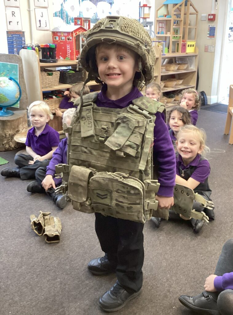 We also had a very exciting visitor this week. A huge thank you to Sgt. Purcell who came in and spoke to us about his job in the army, and brought in his army kit and uniform – the children absolutely loved trying it on!