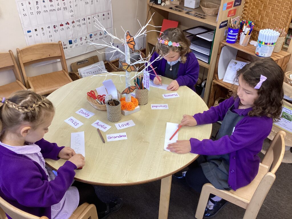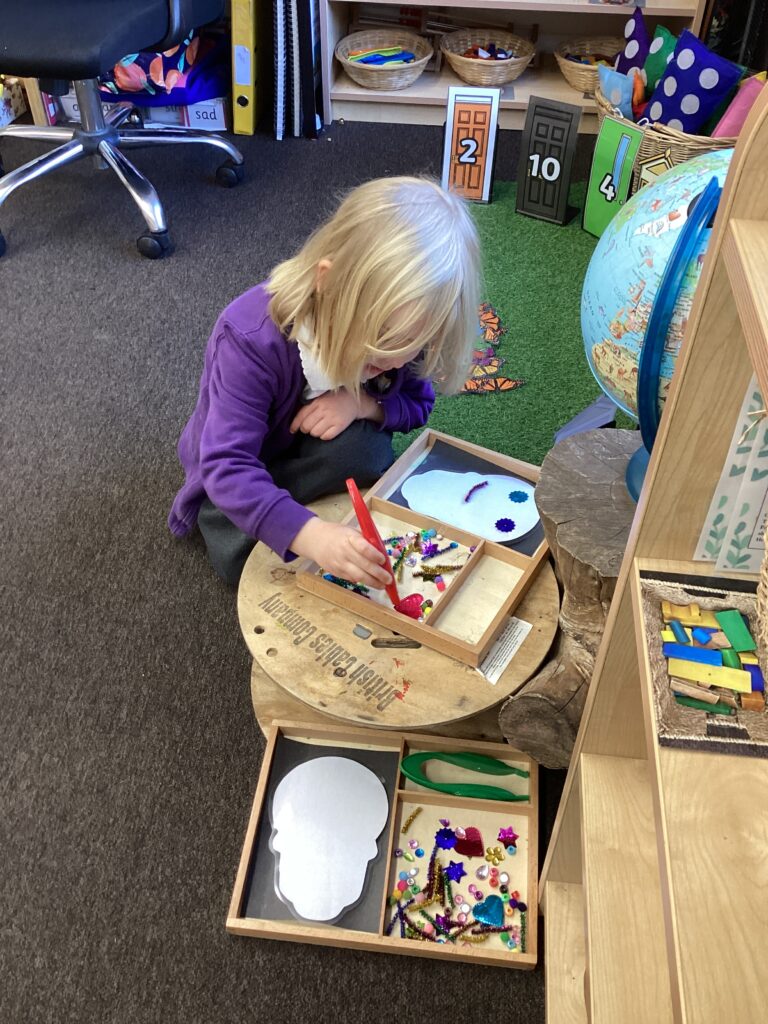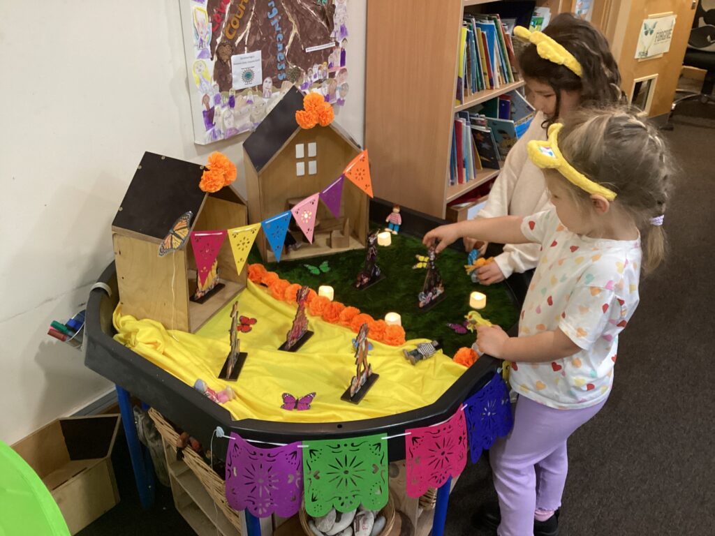 This week we have been diving into the celebration of Dia de los Muertos. We learnt about how and why people celebrate, and discussed how the colours and music made us feel “happy”. We read the story ‘the invisible string’ and talked about how as long as we keep thinking about them, the people we love will always be connected to us. We thought about people who are important to us and those we might miss, drawing pictures of ourselves connected to them. We also wrote messages to people we miss and tied them on our thinking tree. We made our own calavera masks, created butterfly sun catchers, identified shape to make marigolds, and counted out the correct number of butterflies to visit each door. We also had lots of fun playing in the tuff tray!