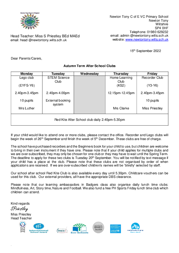 Autumn After School clubs