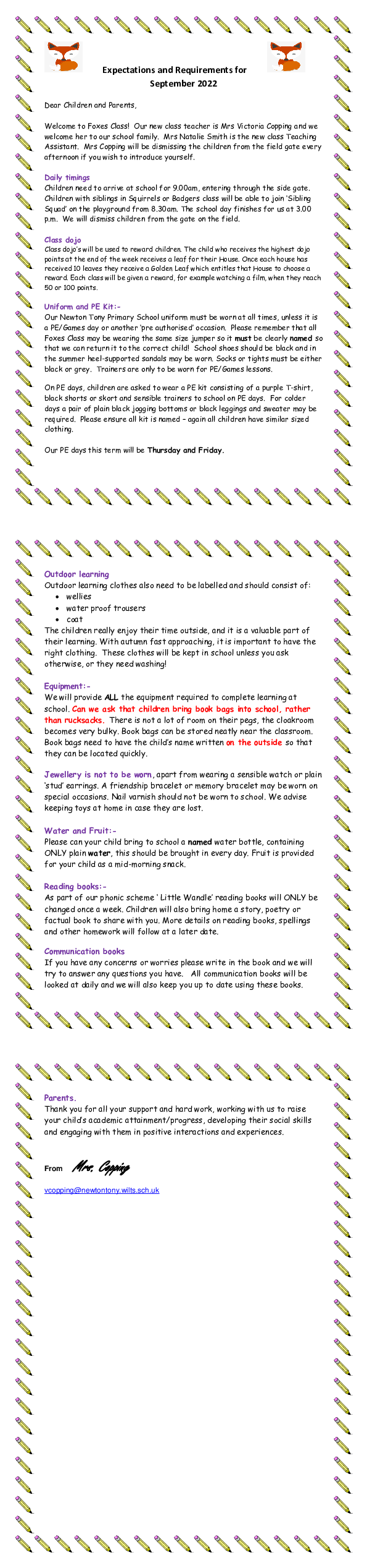 Foxes Class welcome back letter