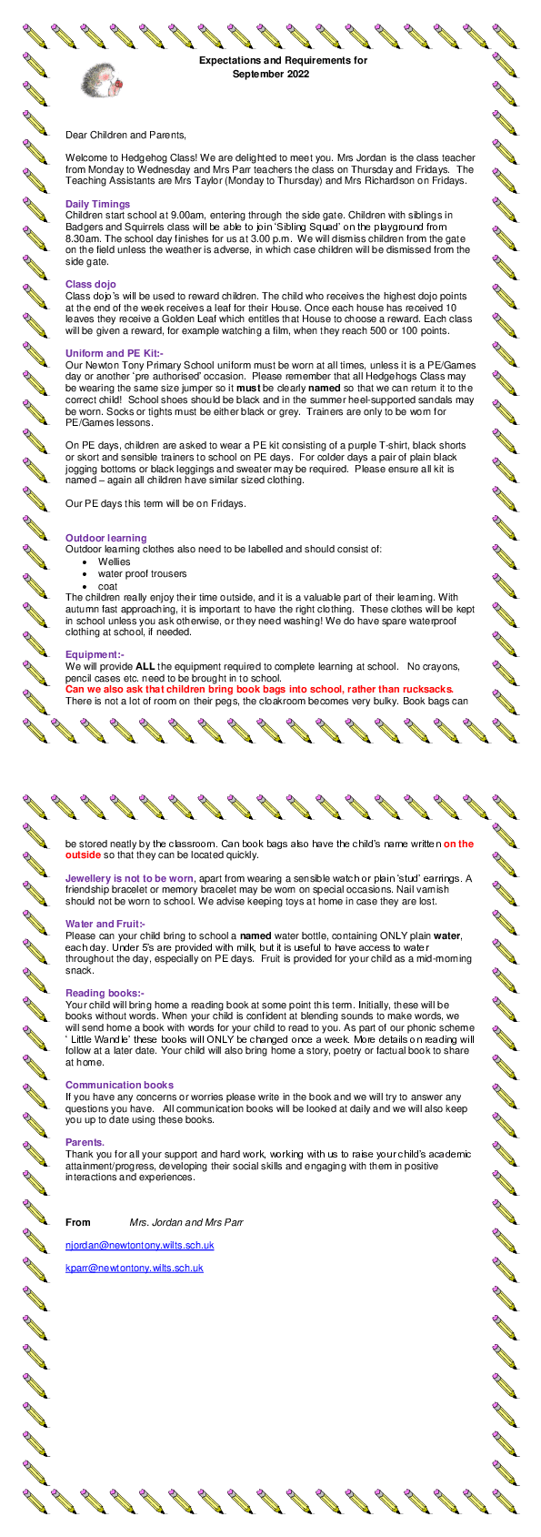 Hedgehogs Class welcome back letter